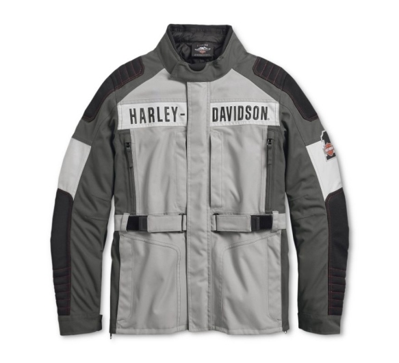 Harley-Davidson® vīriešu Vanocker tekstila jaka ir izgatavota no ūdensizturīga 600 D, 100% poliestera audekla, poliestera sieta ķermeņa odere, poliestera sieta un poliestera tafta piedurkņu odere.