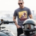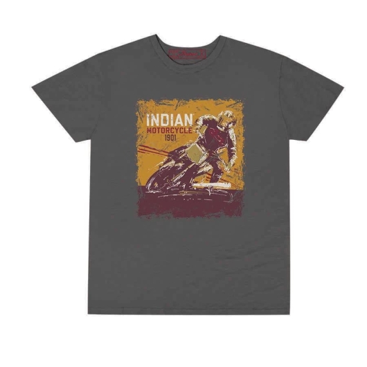 Vīriešu T-krekls ar apdrukātu grafiku, kas svin Indian 50. gadu panākumus Amerikas spīdveja trasē.