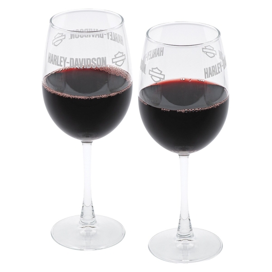 ▪ Divu 450 ml vīna glāžu komplekts ar mākslīgi iegravētu Harley-Davidson logotipu;